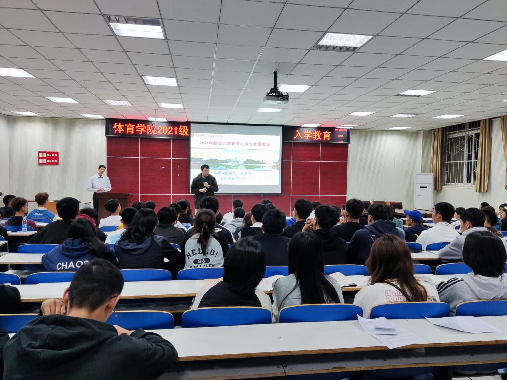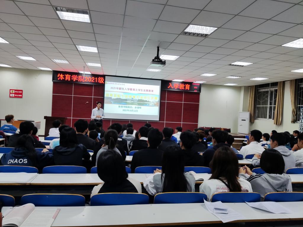 为了提高今年会官网新生对体育专业的认识,帮助2021级新生更好地规划大学生活,明确未来目标和发展方向,今年会官网于10月12日晚,在体育馆多媒体教室举行以“百年目标下的体育专业学生发展教育“主题新生入学教育讲座。本次讲座由jinnianhui今年会院长余道明主讲,辅导员程俊辉、赖梦玥及2021级全体学生参加活动,活动由院党委副书记柴九昌主持。