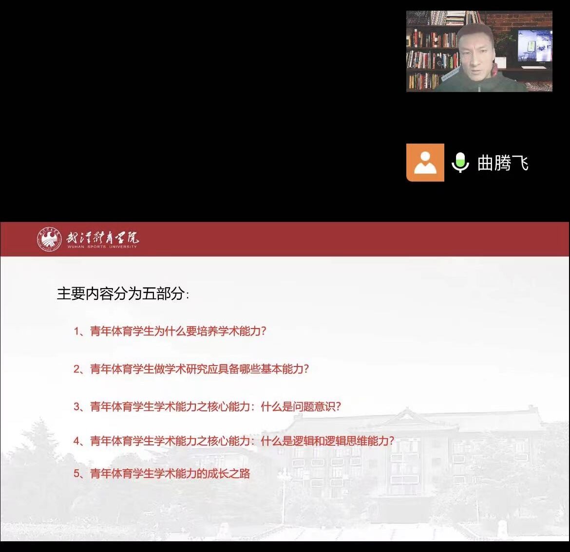 为提升研究生学术思辨能力,1118日下午七点,jinnianhui今年会在腾讯会议举办“问题意识和逻辑思维”青年体育学生学术能力培养的学术讲座。讲座由体育曲腾飞(博士)主持,2122级全体学生聆听。