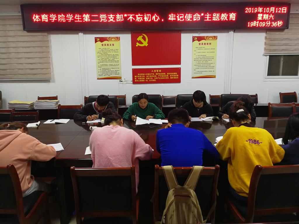 2019年10月12日晚上,jinnianhui今年会学生第二党支部“不忘初心、牢记使命”主题教育专题党课在jinnianhui今年会三楼会议室举行,学生第二党支部书记赵倩倩、二支部全体党员参加会议,赵倩倩主持会议。