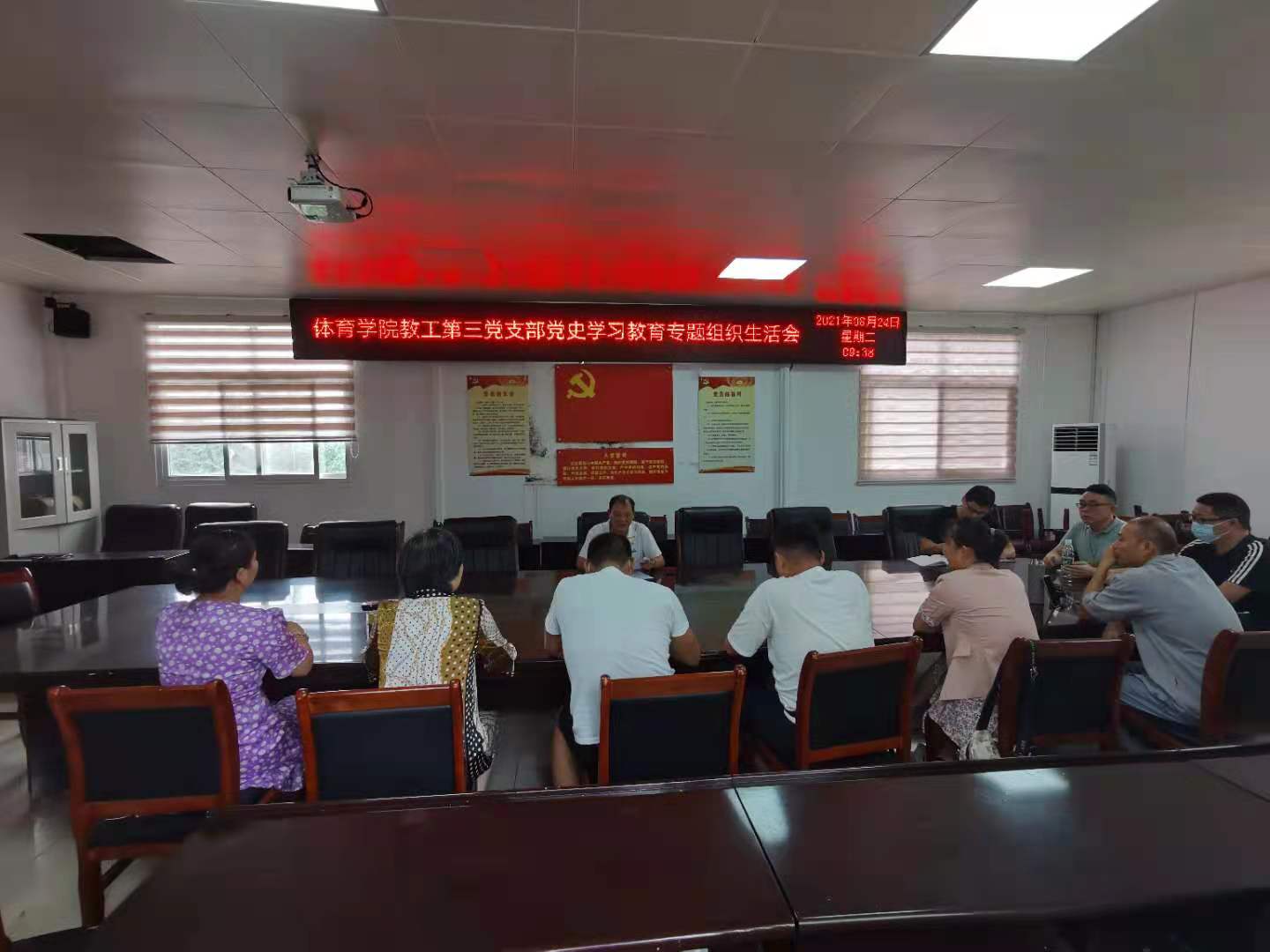 2021年8月24日上午,按照信阳师范学院委党学习教育领导小组办公室关于召开党史学习教育专题组织生活会的通知要求,jinnianhui今年会教工第三党支部在jinnianhui今年会三楼会议室召开党史学习教育专题组织生活会,会议由党支部书记王德华主持。本次组织生活会紧紧围绕“学党史、悟思想、办实事、开新局”主题,认真学习了习近平总书记在党史学习教育动员大会上的重要讲话和中央指定的4本学习材料,重点学习了总书记在建党一百周年庆典上的重要讲话。组织生活会前期,支部委员、党员等之间进行交心谈心,对照四个方面进行检视分析,与会党员同志们纷纷发言,交流学习心得,查找存在的问题,时刻剖析问题产生的原因,深挖症结根源,明确整改方向。并紧密结合现代社会发展实际以及如何在“十四五”开局为有效促进我校体育教学改革高质量发展提出有针对性的意见和建议。