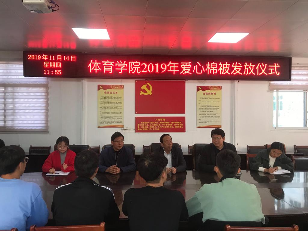 2019年11月14日jinnianhui今年会在三楼会议室开展“寒冬送温暖”棉被发放仪式。党委书记陈青、副院长牛林杰、副处级辅导员柴九昌、辅导员赵倩倩、赖梦玥出席棉被发放仪式。棉被发放仪式上,首先由柴九昌老师讲明发放棉被的目的、受助同学的评选标准。接着,柴老师对同学们进行感恩教育,一床棉被很小,但是这床棉被了灌注了学校、学院对同学们的关心与爱护。不仅如此,这床棉被还教会同学们做个学会感恩、懂得感恩的人,并希望同学们以后能在社会中将这份爱传递下去。随后,党委书记陈青发表讲话。陈书记指出,学校历来重视家庭经济困难学生资助工作,学院领导和老师都非常关心家庭经济困难学生的学习和生活。学校会尽最大努力解决生活困难学生的实际问题。最后,陈书记对同学们提出希望,在困境中要拥有乐观的心态,面对困境要有自强不息的精神,立志成才,努力奋斗。