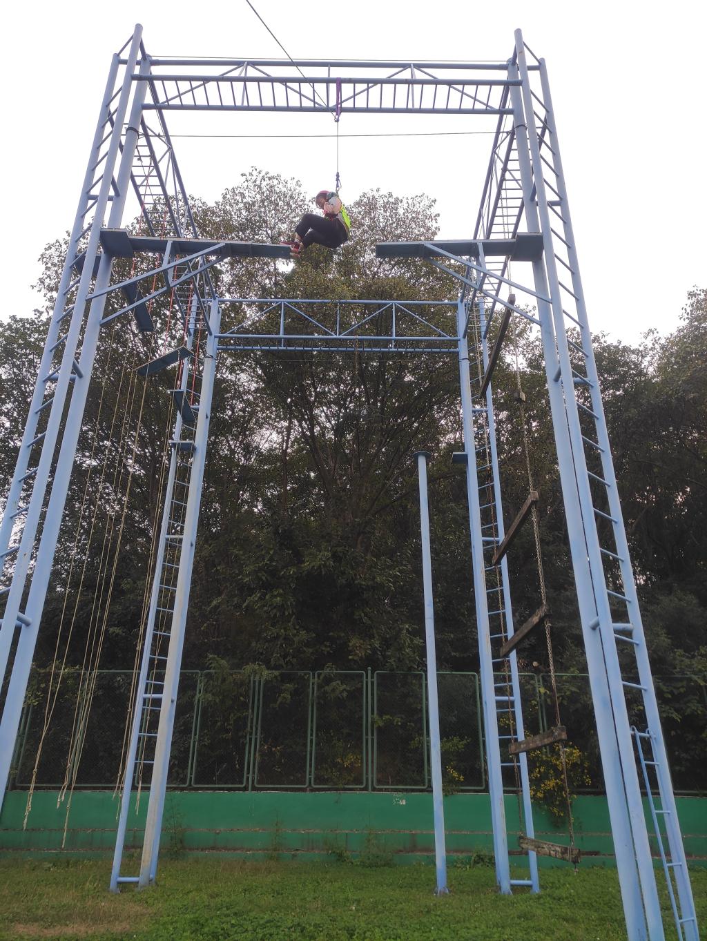 高空断桥。本项目让同学们认识到:挑战自我,激发潜能,培养自信、勇敢、果断的态度与作风;不断突破心理保护层,是成功的关键,通过该项目培养学员心理承受压力的能力和挑战精神,挖掘自己的潜能,并充分享受战胜自我所带来的成就感;树立“爱拼才会赢”的理念,加深对“机遇与挑战”并存的理解;成败与其说是跨越现实距离不如说是跨越心理障碍。