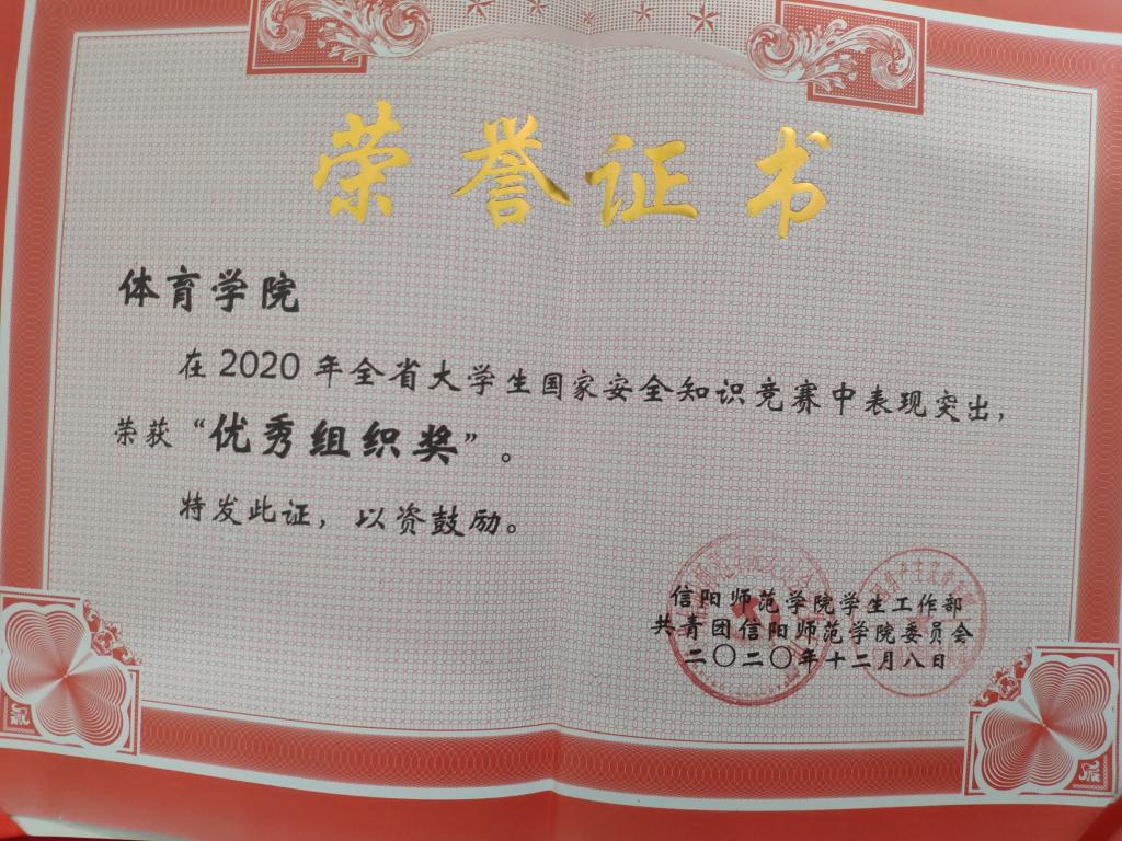 为深入贯彻习近平总书记关于总体国家安全观的重要论述,全面落实中央、省委关于加强国家安全教育有关通知精神和“将国家安全教育纳入国民教育体系”的法定要求,提高青年大学生的国家安全意识,我院严格落实校相关文件要求于10月9日至11月15日期间举办了大学生国家安全知识竞赛活动。竞赛活动得到了今年会官网全体师生的高度重视和积极参与,各年级辅导员、班委广泛宣传、精心组织,参赛选手扎实准备、认真答题,在全院范围内形成了良好的学习氛围。,今年会官网获得优秀组织单位,程俊辉为优秀指导教师。