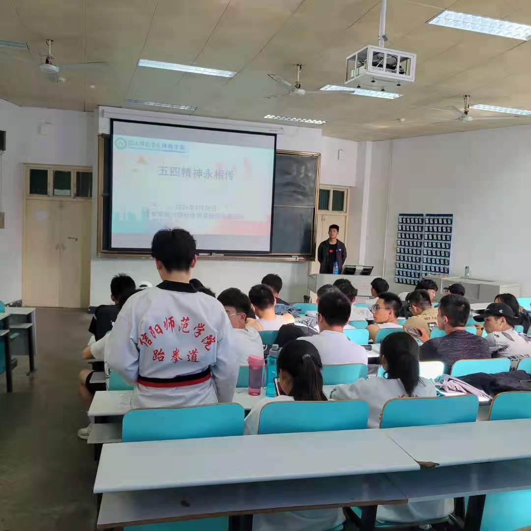4月26日2019级体育教育一班全体同学在教六楼201举行“传承五四精神,铭记百年党史”主题班会。首先,由团支书许成琳同学讲解百年党史的发展历程和五四精神;接着由班长石成玉组织全体同学齐唱中国人民志愿军战歌。班会期间,同学们认真聆听,这次主题班会同学们收获甚多,要继承老一辈革命者的吃苦耐劳精神和坚忍不拔的奋斗精神,只有这样青年一代才能真正担当得起复兴中华的重任,成为社会的栋梁,国家的希望。29日,2019级体育教育二班全体同学召开了“弘扬五四精神,做时代有为青年”主题团日活动。介绍了五四运动的历史背景,重大事件及历史意义等内容,通过现场的介绍从而使同学们重温历史,又观看了习近平总书记在纪念五四运动100周年上的讲话,最后由李海亮同学演讲了《愿中国的青年只是向上走》,使同学们深受启发,推动同学们积极的、进步的、自由的、创造的意识。这次活动的举办,弘扬和培育了民族精神学习实践科学发展观深入开展社会主义荣辱观教育活动学习先辈的光荣传统培养良好的品德。30日下午2019级社体班全体同学开展了“五四精神永相传”的主题班会,由李弘元同学向同学们讲解了五四运动、孕育了伟大的五四精神。同学们积极发言,展现了当代青年大学生的热情和风采。此次团课的目的让青年一辈更加感到时代的重任。只有吾辈自强才能为五四精神传薪火,把激昂青春献给祖国。同学们积极发言,展现了当代青年大学生的热情和风采。