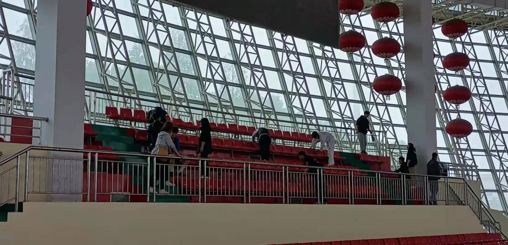 为了方便活动的进行,把大家分为三个小组,活动的主要任务是观众席以及观众席周围的卫生。每一个小组由组长带领进行打扫。活动过程中小组内进行分工合作,不同的人负责不同的区域,有着不同的任务,活动中大家用抹布将坐椅、栏杆擦拭干净,同时有扫地的同学由上到下进行清扫,还有人负责换水清洗抹布,整个过程中活动井井有条,每一份子都有自己的负责区域,整个活动速度比预计的快,同时也提前完成了任务。