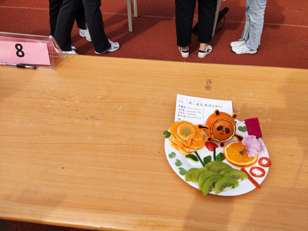 活动开始前参赛选手自由组队成四人队伍,随后每队选手充分发挥动手创新能力,分工明确,互相配合,对准备的水果削皮、切块、雕刻......同时对其进行摆盘,成品在同学们的手下逐渐成形。完成后各队向评委展示作品、讲解寓意,“橙心橙意 墩墩庆周年”、“我辈心向党 情系大别山”、“光辉旗帜”等一个个作品表明青年学生们的追寻信仰之光,勇担青春使命的决心。活动结束后评选出一等奖两队,二等奖三队,三等奖五队,优秀奖十队,并为每队发放奖品。