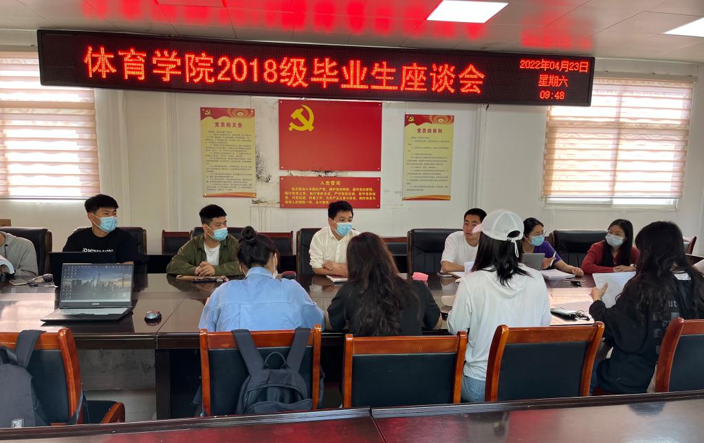 座谈会上,学生代表们就疫情防控期间自己及周围同学所关心的毕业典礼、学士服、论文答辩、求职就业、毕业照等一系列问题进行了咨询,并对学院在课程安排、学生管理、球馆等设施方面存在的问题提出了意见和建议。程俊辉认真听取了学生代表们关心的问题,并逐一进行了细致详尽的解答,并表示会把大家的意见和建议及时反馈给学院程俊辉希望2022届毕业生能倍加珍惜在学校的宝贵时光,自觉遵守学校相关疫情防控规定,带头守好校园疫情防控安全门;在学习和生活上积极调适自我状态,有条不紊的完成毕业论文和做好毕业答辩,把学院优良的学风继承和传递下去;在就业上保持积极主动、乐观向上的态度,最后以勇往直前奋发进取的蓬勃朝气和青春活力,为绚丽多彩的大学生活画上最圆满的句号。