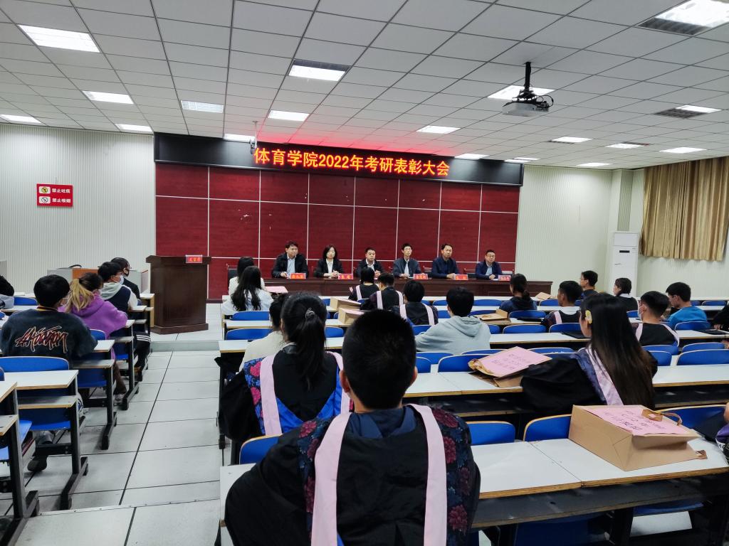 5月9日下午,体育学院2022年考研表彰大会在体育馆多媒体教室举行。jinnianhui今年会党委书记张晓峰、院长余道明、副院长杨晶伟、张翔、张娟,副书记柴九昌、全体辅导员、2018级考取硕士研究生学生代表、2019级、2020级、2021级在校生代表参加会议,会议由学院党委副书记柴九昌主持。
