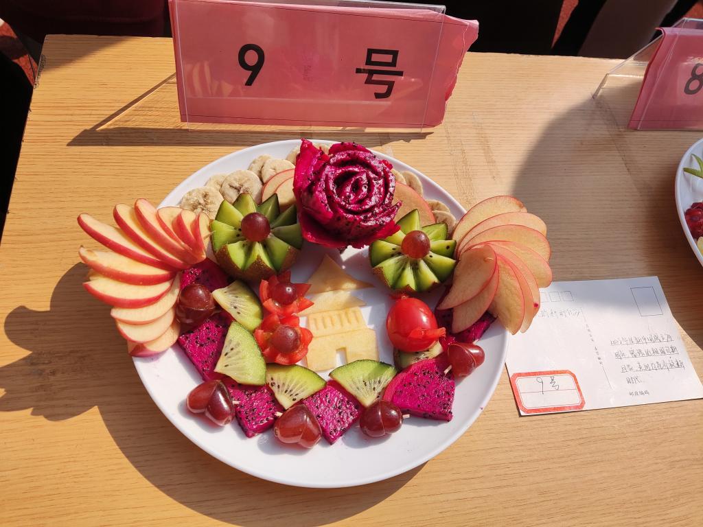 活动开始前参赛选手自由组队,每队四人,活动开始后每队选手充分发挥动手创新能力,分工明确,互相配合,水果削皮、切块、雕刻......同时对其进行拼盘,成品在同学们的手下逐渐成形。完成后各队向评委展示作品、讲解设计理念,作品“红船精神”100多年前,一艘画舫,承载着缔造中国共产党的使命,点燃了中国革命的火种,水果拼盘的红船,代表着中国共产党人不忘初心,筑梦新时代、启航新征程;“红星照耀中国”寓意我们会一直在五星红旗的指引下,为祖国的繁荣昌盛努力奋斗;“爱我中华”寓意中华民族繁荣富强,乘风破浪,扬帆起航,56个民族像石榴籽一样紧紧团结在一起;“薪火相传守初心 红船精神植心中”表明我们会在红船精神的指引下不忘初心,牢记使命,砥砺前行;“有国才有家”表明了青年一代对家的眷恋,对祖国的热爱等。活动评选出一等奖一队,二等奖两队,三等奖三队,优秀奖五队,并为获奖队伍发放奖品。