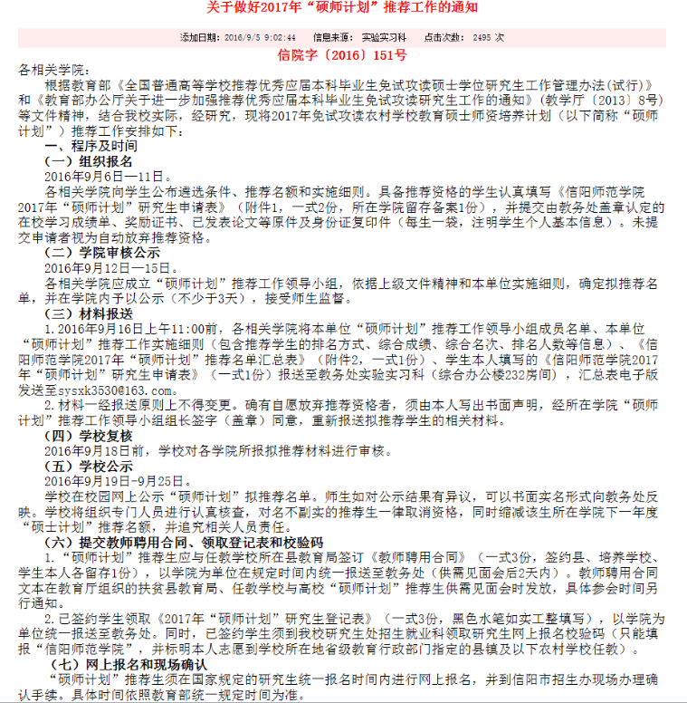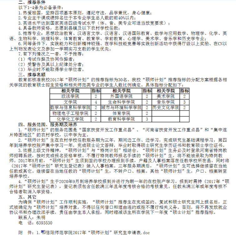 “硕师计划”服务于“国家扶贫开发工作重点县”、“河南省扶贫开发工作重点县”和“集中连片特困地区”的农村学校,以中学为主,服务期为三年,期间边工作、边学习,完成研究生基础课程学习,第四年到培养学校脱产集中学习一年,完成硕士论文答辩,毕业时取得硕士研究生学历证书和教育硕士学位证书。具有特岗与支教性质,是提升农村中小学教育水平的重要方式和途径。