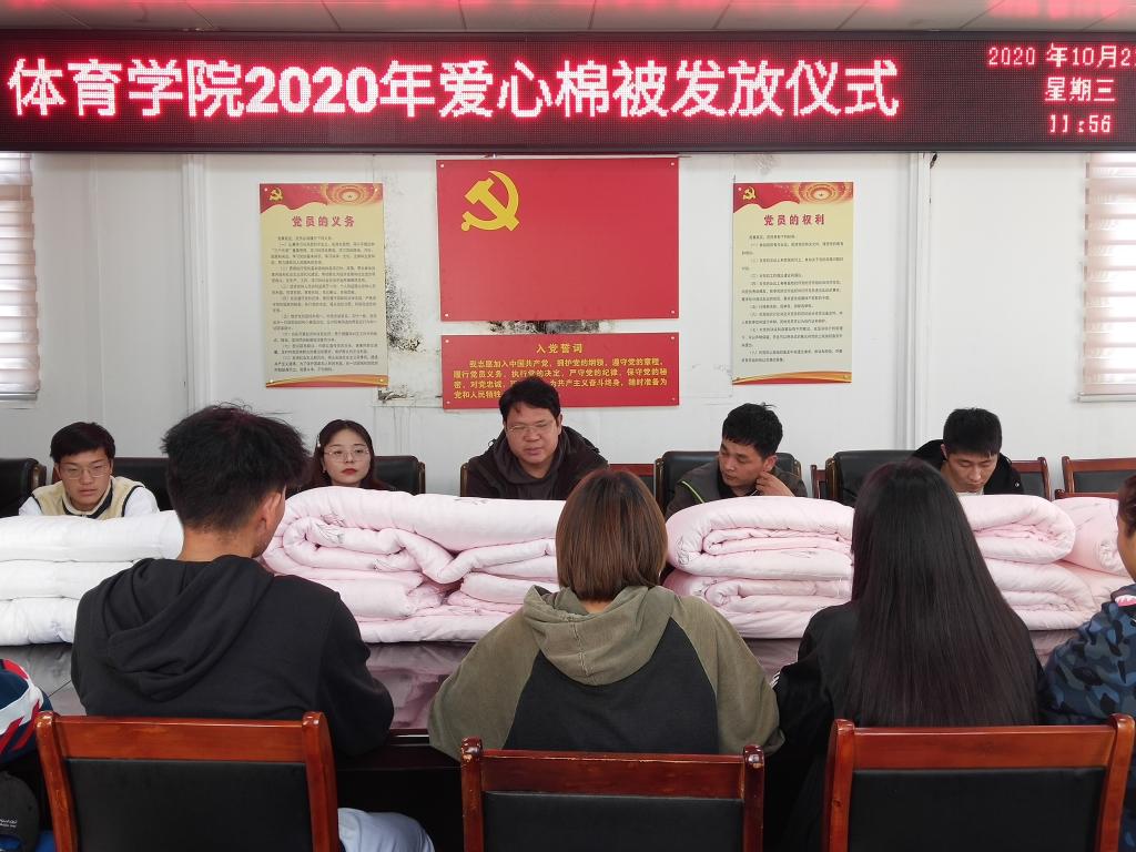 会上,柴九昌发表了讲话,表达了国家和学校对青年大学生的关心和爱护,还建议同学们珍惜大学时光努力学习,生活中加强身体锻炼,拥有健康的体魄。最后,给同学们一个衷告:无惧生活中的困难,学习是重心,希望同学们在学校快乐学习,快乐生活。仪式最后,参会的领导老师为今年会官网学生代表发放棉被。