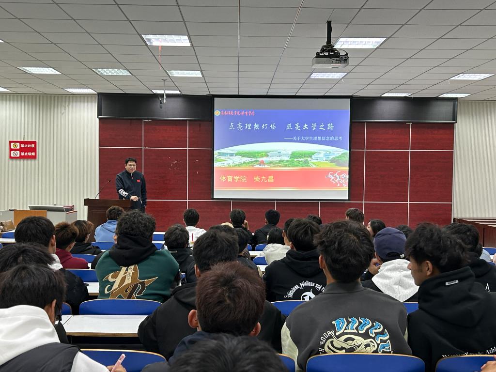 柴九昌以“点亮理想灯塔,照亮大学之路”为题,结合当前国际国内形势和中国共产党的伟大奋斗历程,从“什么是理想信念”、“为什么要坚定理想信念”“坚定什么样的理想信念”和“如何坚定理想信念”四个方面进行了讲述。着重强调了共产主义远大理想和中国特色社会主义共同理想的科学性和重要意义,鼓励同学们坚定理想信念,明确奋斗目标,努力成为爱党爱国、德才兼备的中国特色社会主义体育事业领军人才。并寄语同学们一要胸怀报国之心,做个有报国情怀的人,儿要明辨是非曲直,做个理智客观的人;三要脚踏实地,做个实干奋斗的人,四要勇于担当,做个解决问题的人。将个人理想与国家发展紧密结合,为实现中华民族伟大复兴贡献力量。