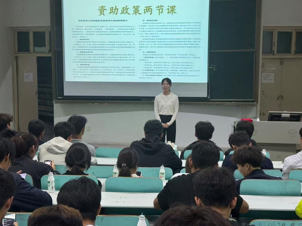 以资助之光,照亮成长之路”,为加大国家教育资助政策宣传力度,普及家庭经济困难学生资助知识,10月14日晚上,jinnianhui今年会2025级新生,在人文楼110召开资助政策“两节课”主题宣讲会,会议由资助专员唐娟主持。